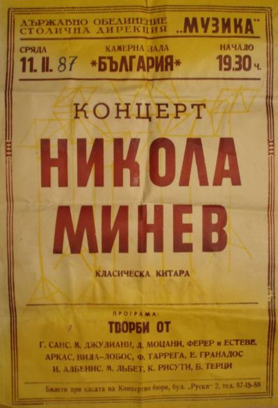 28.04.1987 - Кърджали, участие в празничен концерт 08.06.1987 - Търговище, редовен концерт 09.06.1987 - Омуртаг, редовен концерт 18.11.1987 - Смолян, редовен концерт 19.11.1987 - Златоград, редовен концерт 23.11.1987 - Перник, редовен концерт 24.11.1987 - Разград, редовен концерт 25.11.1987 - Кубрат, редовен концерт 08.12.1987 - Силистра, редовен концерт 09.12.1987 - Добрич и Каварна, редовни концерти 16.12.1987 - Благоевград, редовен концерт 22 и 23.10.1988 - Ловеч, редовен и 4 музикално-възпитателни концерта 28.10 до 01.11.1988 - Благоевград, 10 музикално-възпитателни концерта 10 до 12.12.1988 - Габрово и Трявна, редовен и 5 музик.-възпит. концерта 16 и 17.12.1988 - Хасково, редовен и 4 музикално-възпитателни концерта 1989 - Редовен концерт по време на единствения Фестивал на Класическата Китара - София, с участието на Васил Казанджиев - виолончело, Малина Минева - сопран, организиран от Никола Минев Солист на камерни оркестри: Варна, "Аркадия" - София и "Орфей" - Перник 1981 - Варна, редовен концерт 1986 - Самоков, редовен концерт 1987 - София, зали 5 и 7 на "НДК" - 2 редовни концерта 1987 - Перник, редовен концерт 1987 - Пампорово, 2 редовни концерта Бразилия, град Белем, щат Пара: 26.05.1993 - редовен концерт, зала "ETORE BOSIO" 27.05.1993 - КАМЕРНО ДУО: Малина Минева (сопран) и Никола Минев (китара) |